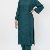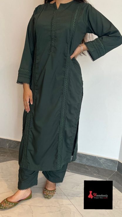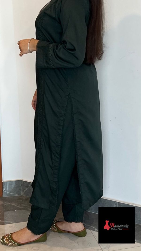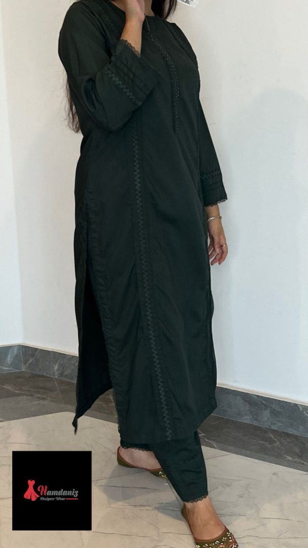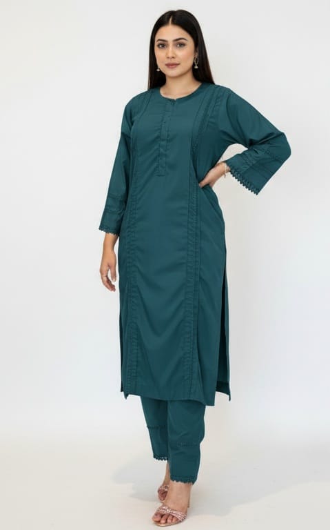 Style: Elegant stitched 2-piece set featuring a solid-colored kurta with delicate lace finishing on the sleeves, paired with straight-fit trousers. A versatile outfit perfect for casual wear and semi-formal gatherings.