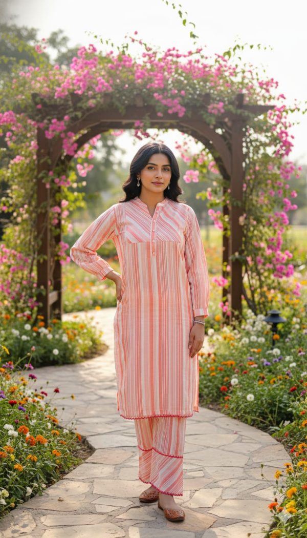 A breezy and elegant 2-piece outfit crafted from lightweight Doria Lawn. The design features a soft peach and white striped pattern that exudes effortless summer charm. The set includes a long, straight shirt paired with a matching trouser, perfect for everyday wear or casual gatherings.