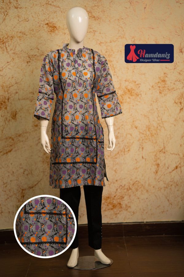 Step into effortless elegance with this straight kurta style shirt and trouser set in a sophisticated gray tone. Made from breathable 100% paper lawn for the shirt and lawn fabric for the trousers, this outfit promises both comfort and style in warmer weather. The classic block print design features a tasteful blend of orange and purple motifs, while the round neck with button patti and smart fit silhouette add a refined touch.