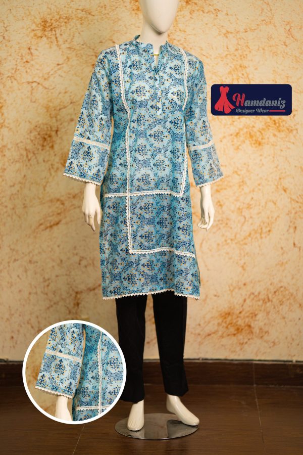 Description: This elegant and vibrant baby blue outfit features a straight-cut kurta adorned with white lacework. The dress includes matching lace details, buttons neck design adding a touch of sophistication. The matching trousers complement the top, creating a cohesive and stylish ensemble.