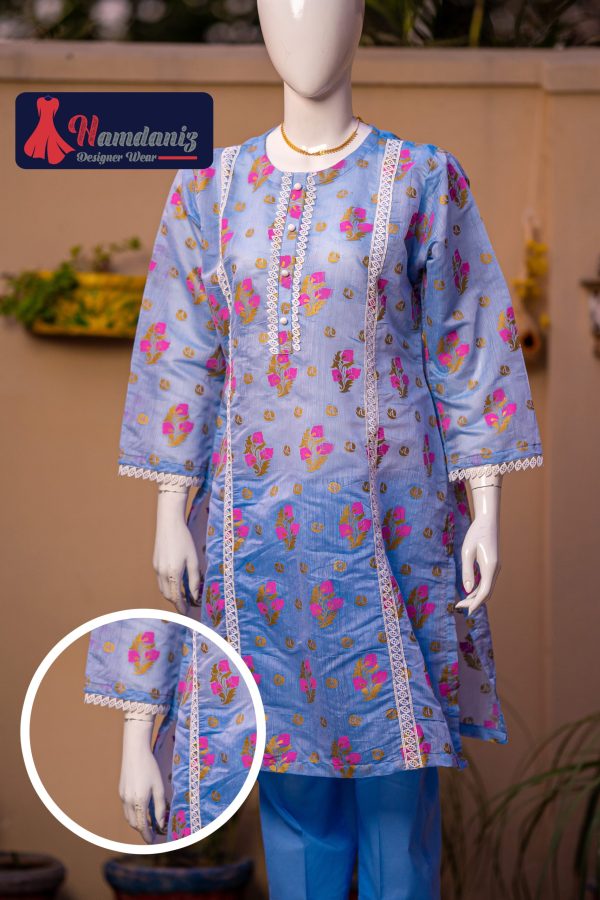 Description: This elegant and vibrant baby blue outfit features a straight-cut kurta adorned with white lacework. The dress includes matching lace details, buttons neck design adding a touch of sophistication. The matching trousers complement the top, creating a cohesive and stylish ensemble.