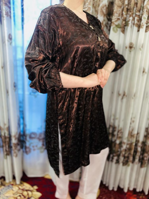 Stay cozy yet chic with this Winter Silk Two-Piece Suit. The rich dark brown silk shirt features a subtle self-printed floral pattern with delicate button details, paired with a crisp plain white trouser for a graceful contrast. The warm and glossy silk fabric makes it an ideal choice for winter evenings and festive gatherings.