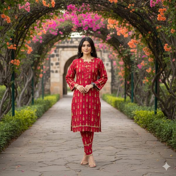 Description: This elegant and vibrant red yellow outfit features a straight-cut kurta adorned with golden motifs. The dress includes golden lace details, beads neck design adding a touch of sophistication. The matching trousers complement the top, creating a cohesive and stylish ensemble.