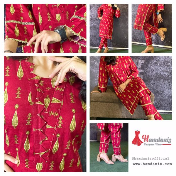 Description: This elegant and vibrant red yellow outfit features a straight-cut kurta adorned with golden motifs. The dress includes golden lace details, beads neck design adding a touch of sophistication. The matching trousers complement the top, creating a cohesive and stylish ensemble.