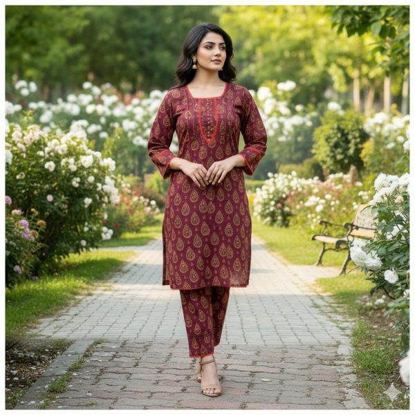 Description: This elegant and vibrant maroon outfit features a straight-cut kurta adorned with green and red motifs. The dress includes red lace details, beads neck design adding a touch of sophistication. The matching trousers complement the top, creating a cohesive and stylish ensemble.