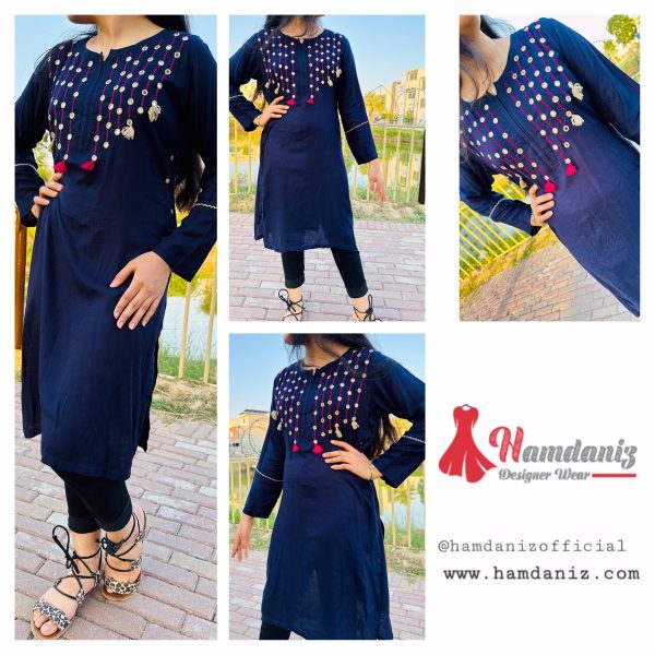 • Purple self-linen shirt with intricate yellow and blue embroidery on the neckline and front.