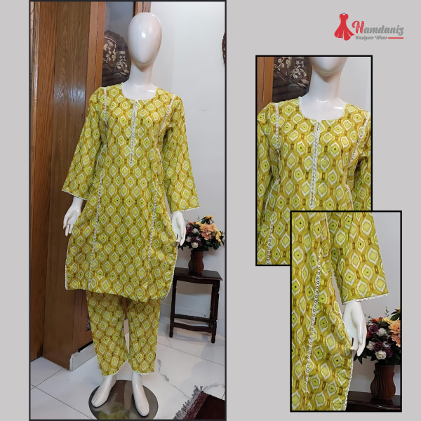 The lace detailing on these outfits adds a delicate and elegant touch, enhancing their overall appeal. Each dress features intricate lacework on the sleeves, borders, and neckline, creating a graceful and feminine look. The fine lace patterns complement the printed fabric beautifully, adding depth and texture. Whether subtly lining the hem or adorning the sleeves, the lacework brings a refined charm to these ensembles, making them perfect for both casual and semi-formal wear.