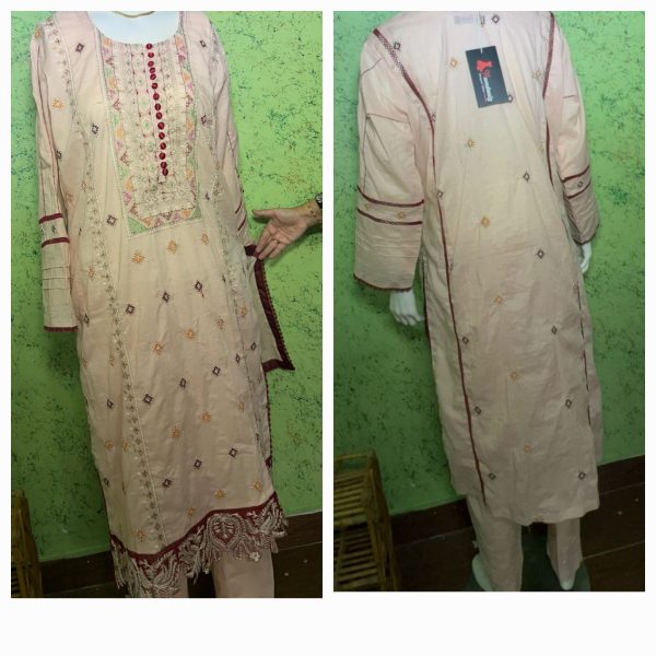 Elevate your traditional wardrobe with this elegant light Peach embroidered suit, a perfect blend of subtlety and sophistication. The front panel showcases intricate floral and geometric embroidery in shades of maroon, mustard, and lavender, creating a refined and feminine look. A line of maroon fabric buttons adds a pop of color and charm to the neckline.