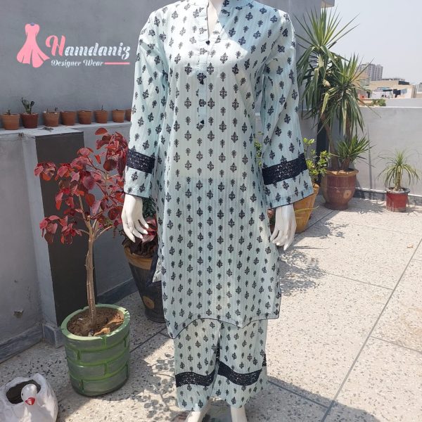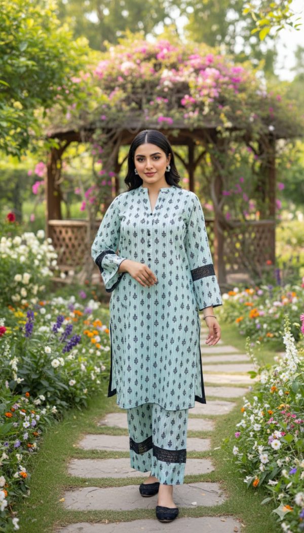 Refresh your wardrobe with this sophisticated 2-piece Doria Lawn suit (HS420) that blends classic charm with breathable comfort. Crafted from premium Doria Lawn fabric, this outfit is tailored to keep you effortlessly cool while offering a polished appearance. The shirt showcases a delicate vertical stripe pattern overlaid with an all-over motif print, accentuated by elegant lace detailing on the sleeves and pants. Featuring a graceful neckline and a flattering long-length cut, this ensemble strikes the perfect balance between tradition and contemporary styling. The wide-leg trousers complement the shirt beautifully, adorned with matching lace for a cohesive and refined finish. Whether you’re heading to a casual lunch or a relaxed gathering, this piece ensures you stay chic and comfortable all day long.