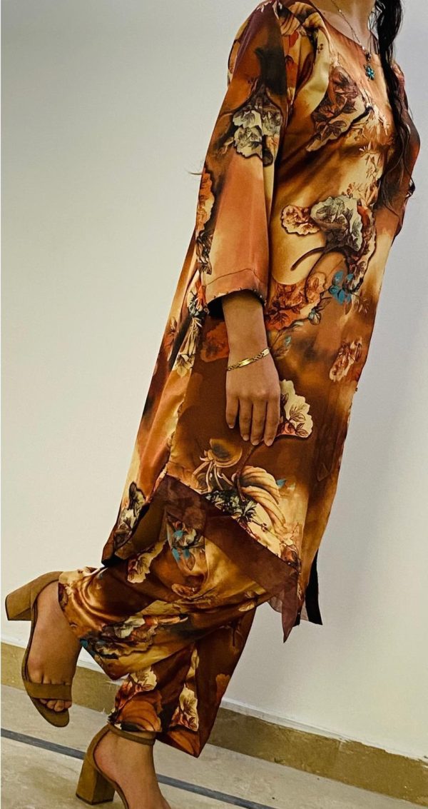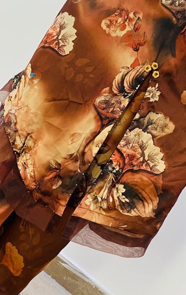 Elevate your wardrobe with this luxurious silk printed 2-piece suit in rich earthy brown tones. The artistic floral print paired with premium silk fabric gives it a chic and timeless appeal. Designed with modern cuts and fine detailing, this stitched suit is ideal for both casual gatherings and semi-formal occasions.