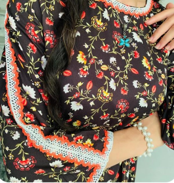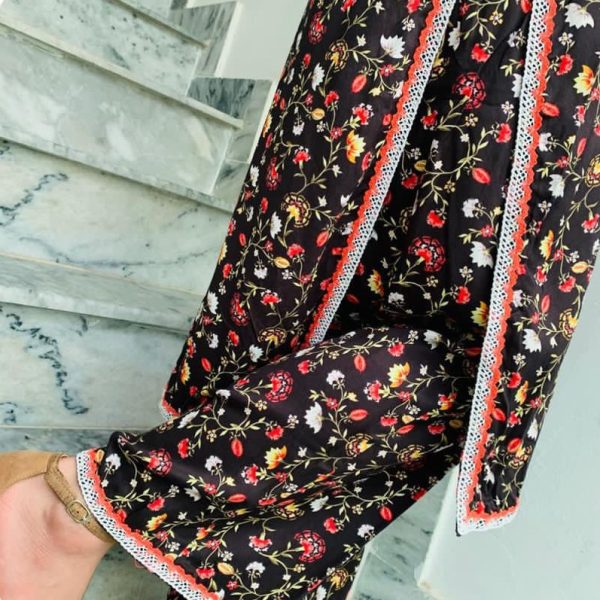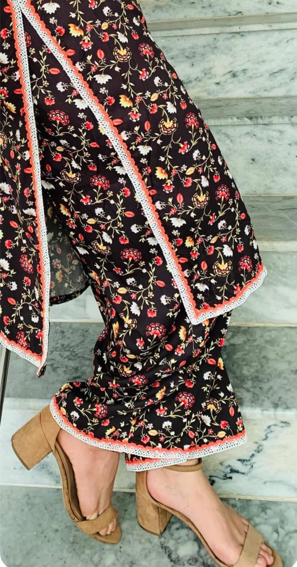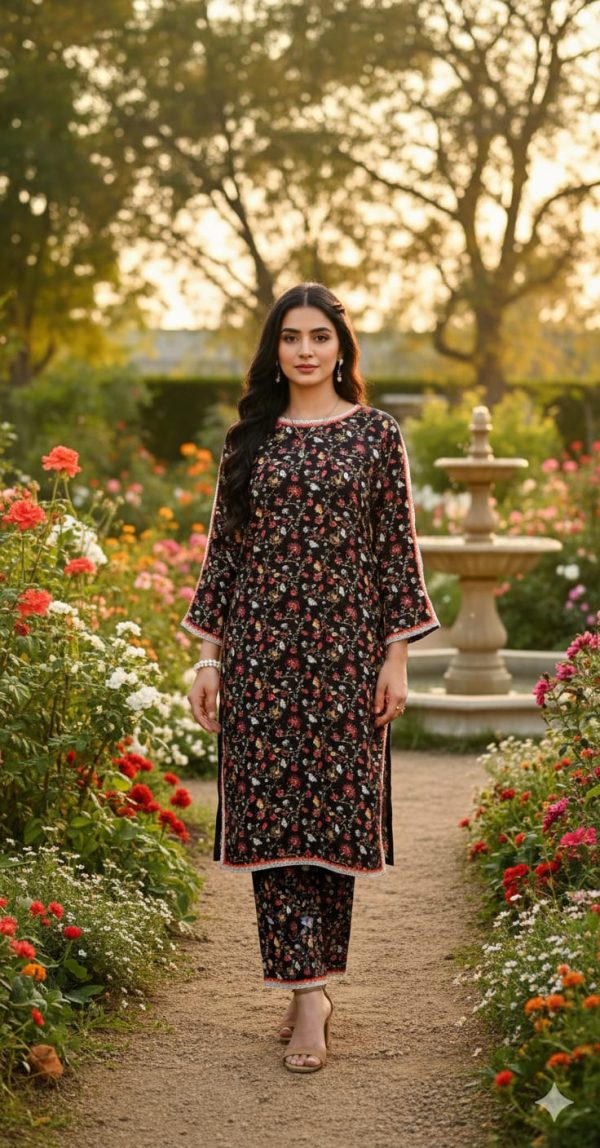 This outfit is a two-piece stitched ensemble consisting of a kurta and trousers with the following details: