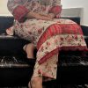 Accents: Red lace and sheer detailing add sophistication and charm to the outfit.