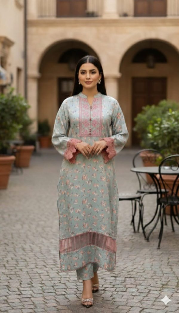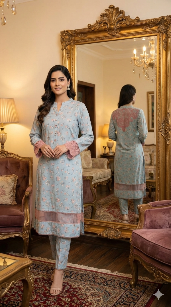 A beautifully detailed ensemble blending classic embroidery with modern lace work.