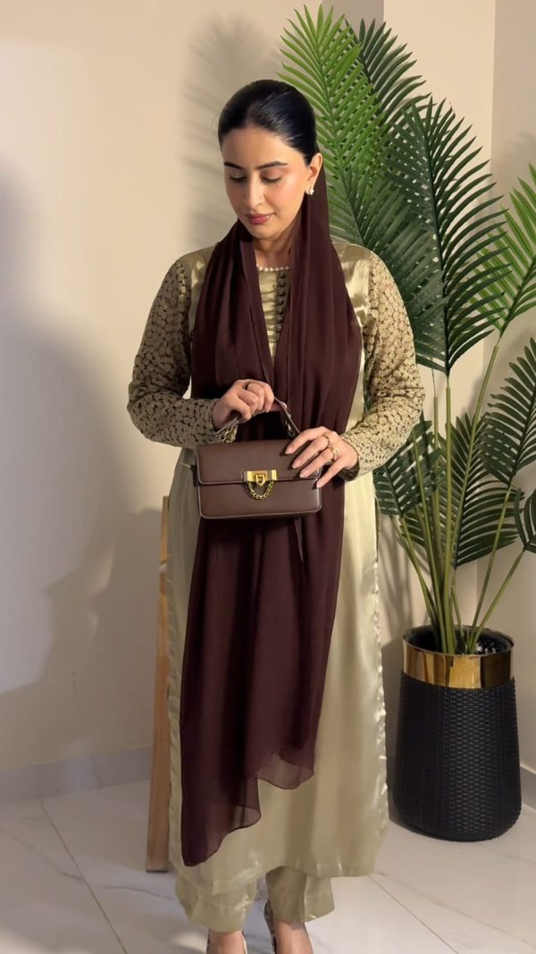 The silhouette appears to be a straight, long dress with a modest fit.