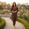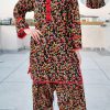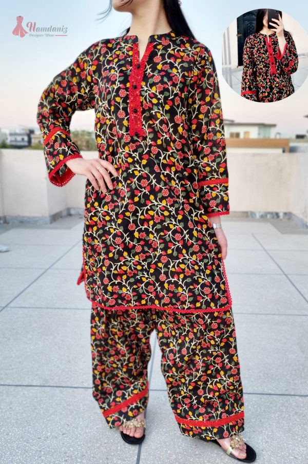 • Fabric: The outfit is made from lawn fabric, a dark base fabric with floral patterns in red, yellow, and green.