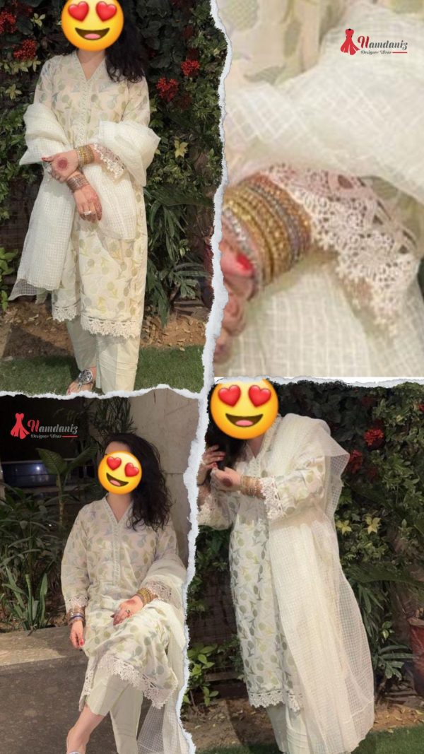 Paired with it is a textured Brochia trouser, designed to offer a structured yet comfortable fit. The tactile fabric and minimal detailing strike the right balance between casual and sophisticated, making the outfit versatile enough to dress up or down. Paired with regular size organza duppatta.