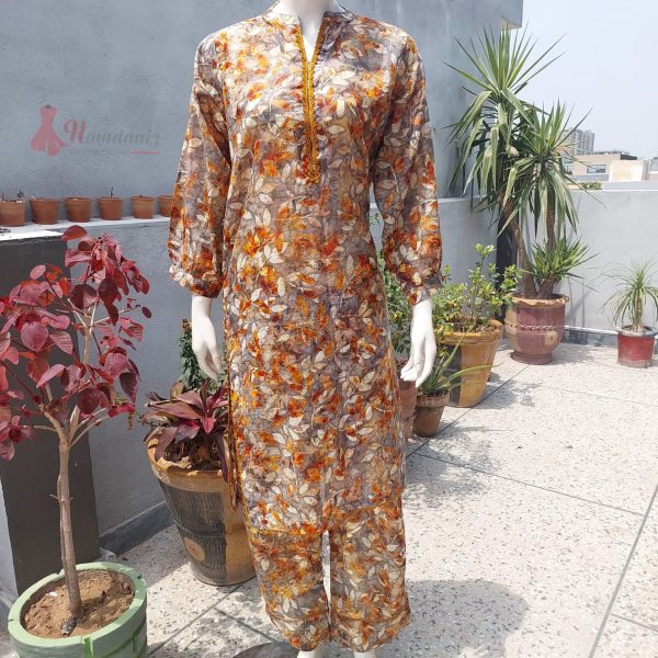 Upgrade your summer wardrobe with this beautifully stitched 2-piece outfit, crafted from breathable Doria lawn fabric. Perfect for hot weather, this suit offers both comfort and style with its lightweight texture and vibrant leaf print in earthy tones of orange, beige, and grey.