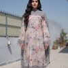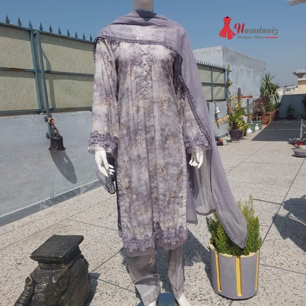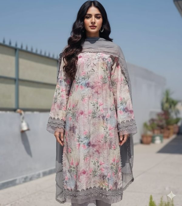 A subtle yet sophisticated ensemble, this suit features a soft-toned floral print with detailed chicken embroidery that adds a layer of depth and elegance. The lace-trimmed sleeves and hem offer a touch of femininity. Paired with a matching dupatta and plain white trousers, this look is effortlessly graceful. Style with light makeup, a nude lip, and simple jewelry for the perfect summer statement.