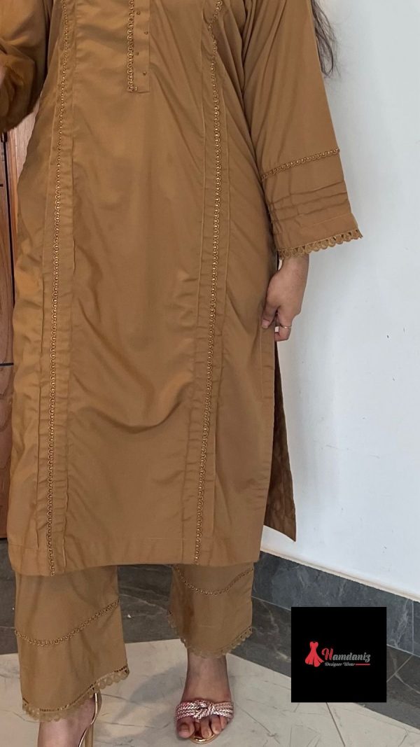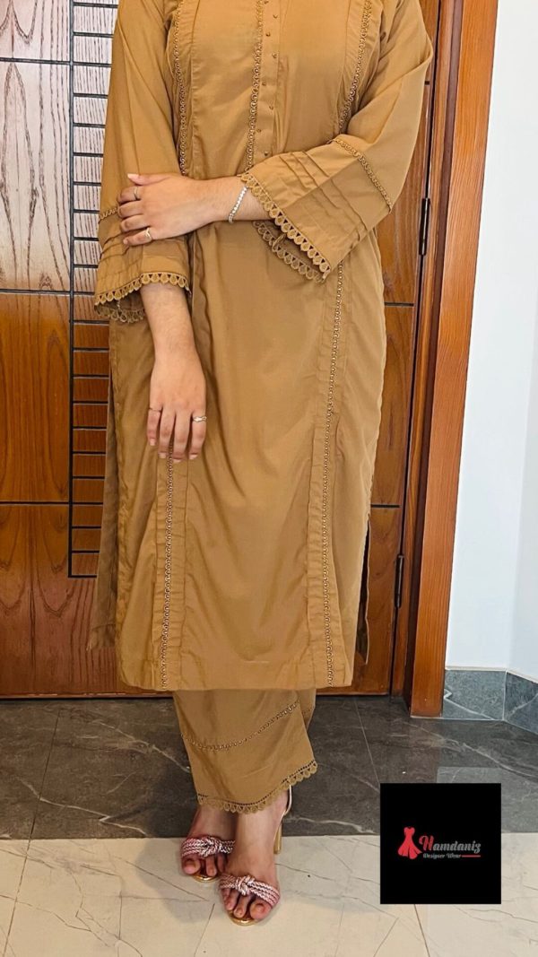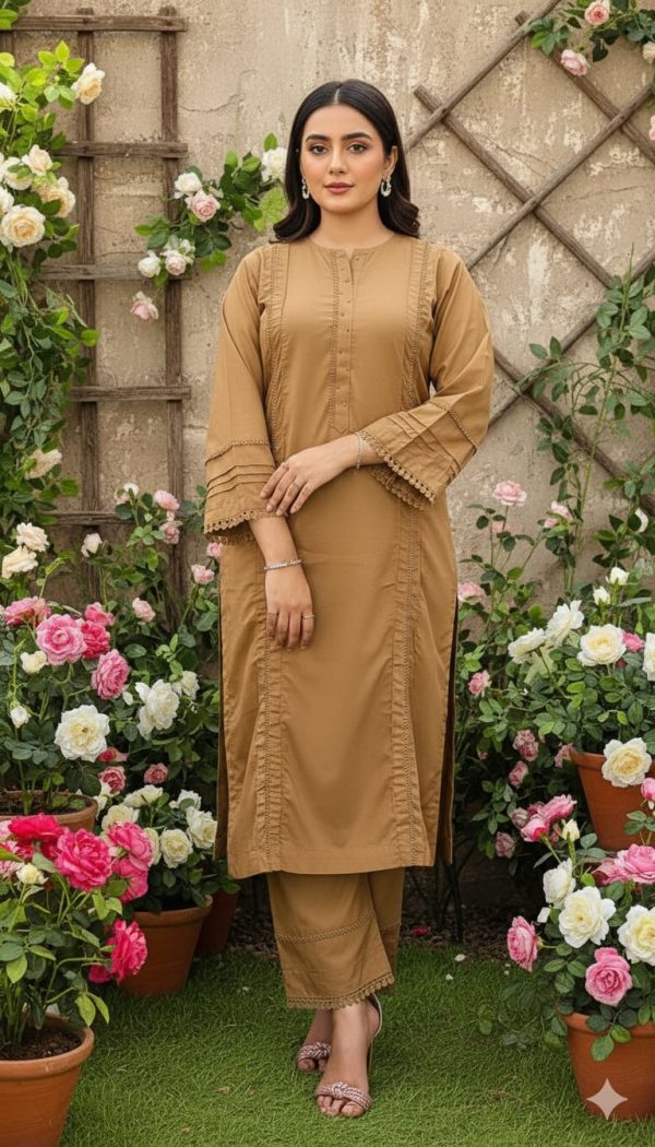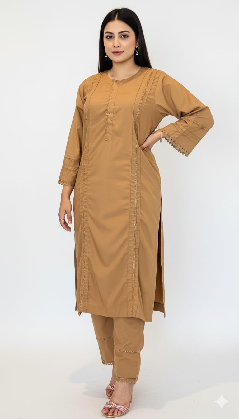 Style: A classic stitched 2-piece outfit featuring front panel detailing with lace-trimmed sleeves, paired with straight-fit trousers. Designed for elegance and comfort, this suit is perfect for daily wear as well as semi-formal occasions.