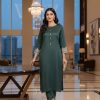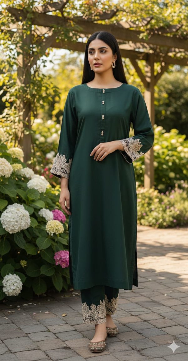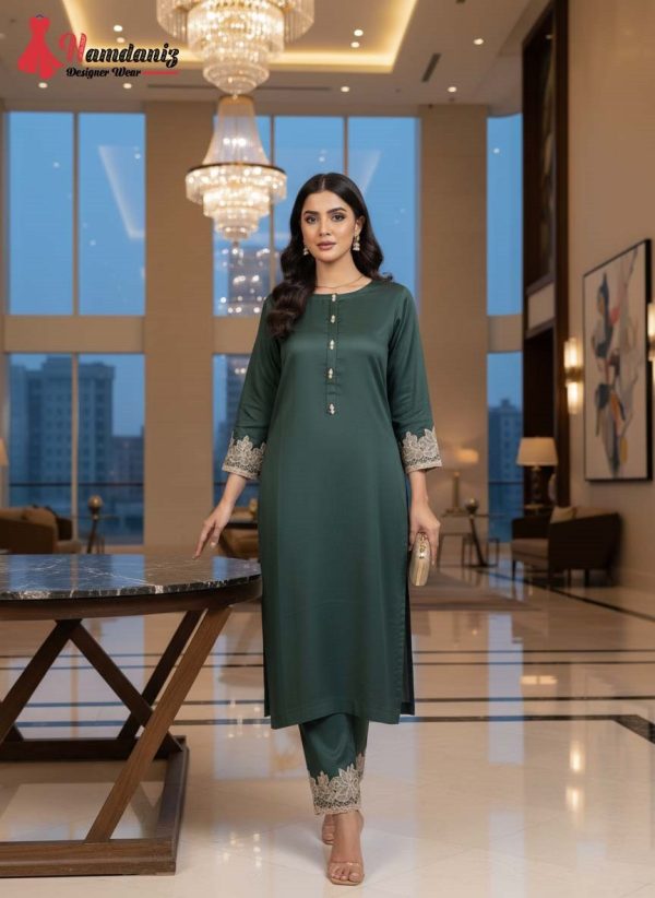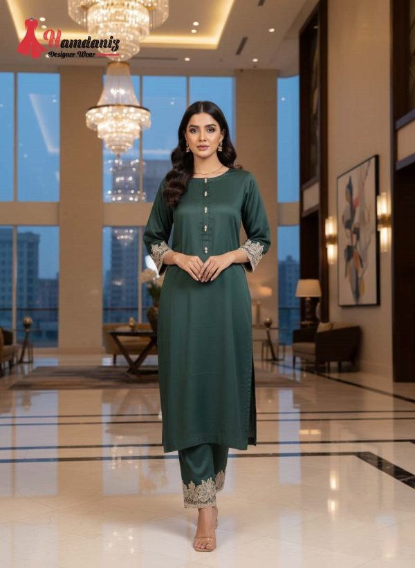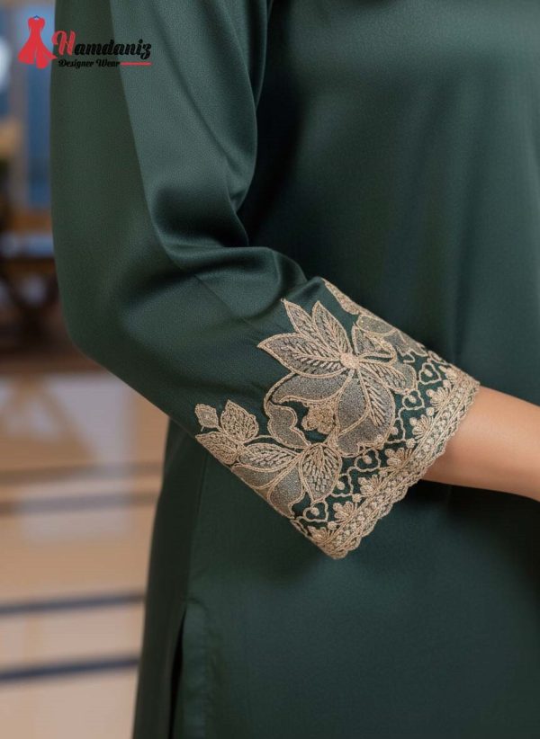 A sophisticated design in a rich emerald green, blending effortless wearability with tasteful embroidery and contemporary accents—perfect for timeless everyday elegance.