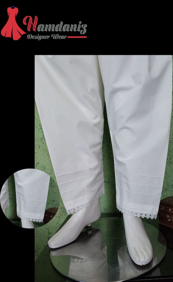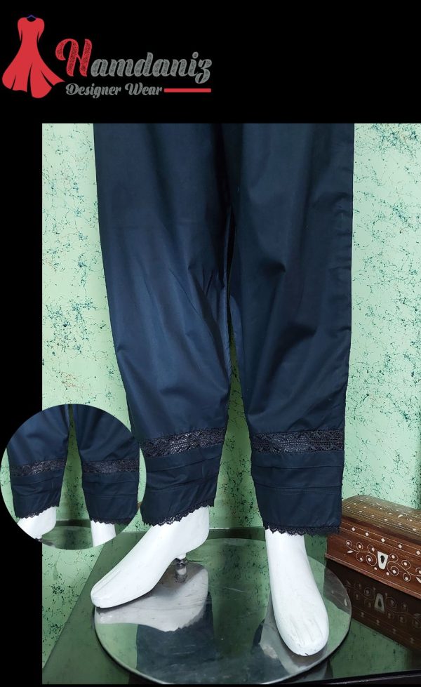 • Description: A solid wide-leg shalwar Embellished with Lace and pintex.