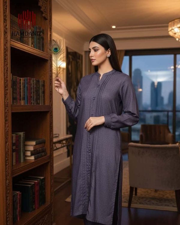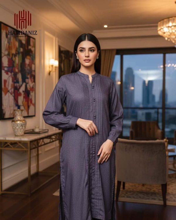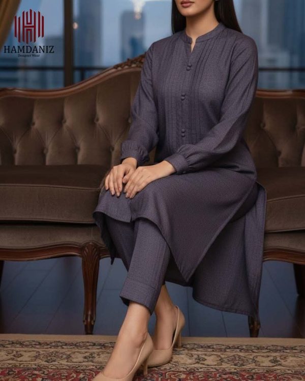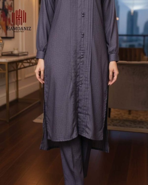 - Shirt: Plain shirt in a refined Deep Purple shade, detailed with neat vertical pintucks on the front and finished with matching buttons for a polished look.