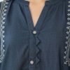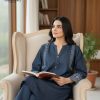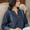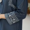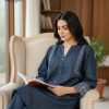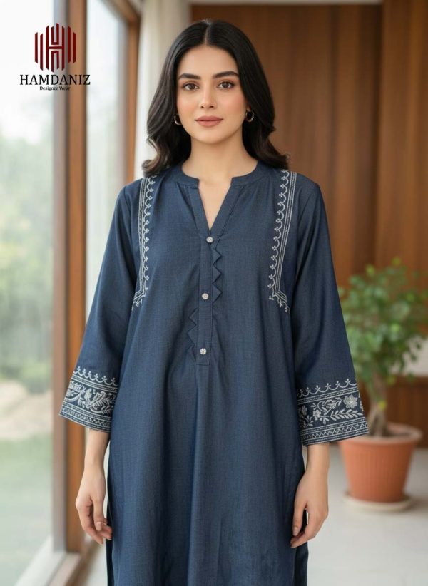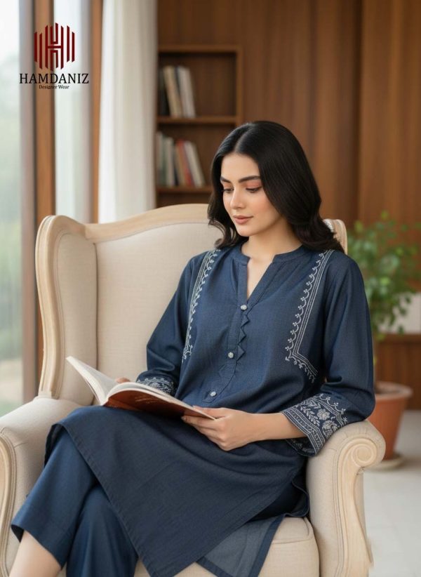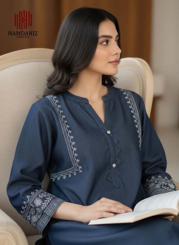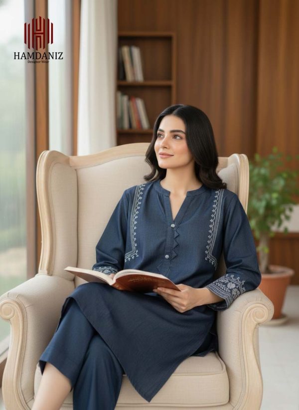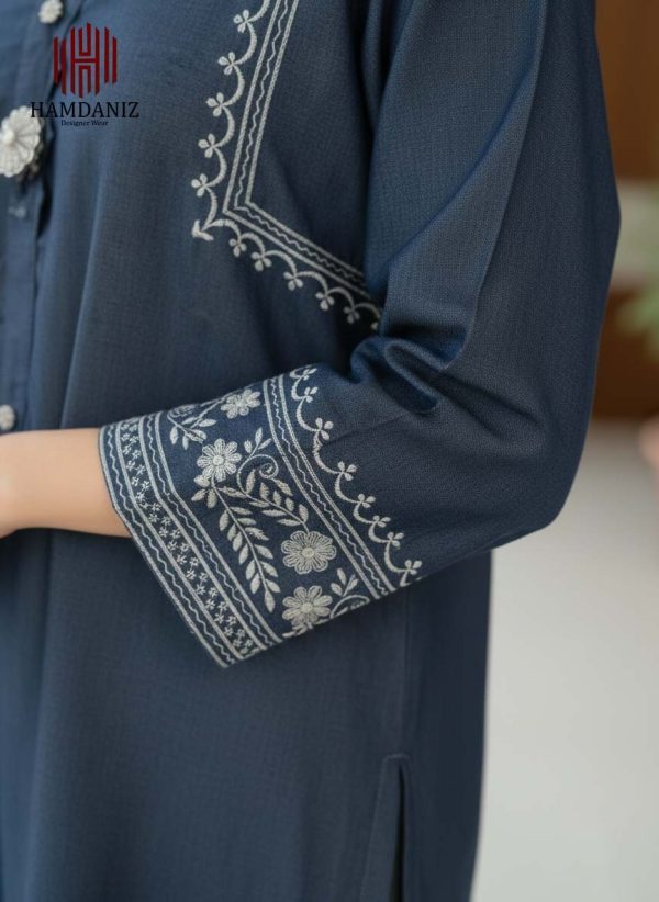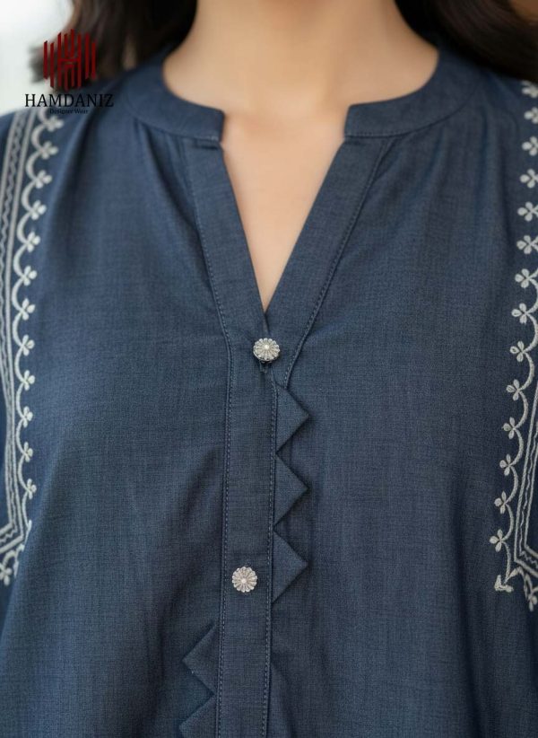 - Shirt: 1-Piece in a deep Midnight Blue shade, crafted with a soft, denim-like texture. Features a unique zig-zag fabric placket adorned with sparkling crystal buttons, and bold white contrast embroidery on the neckline.