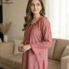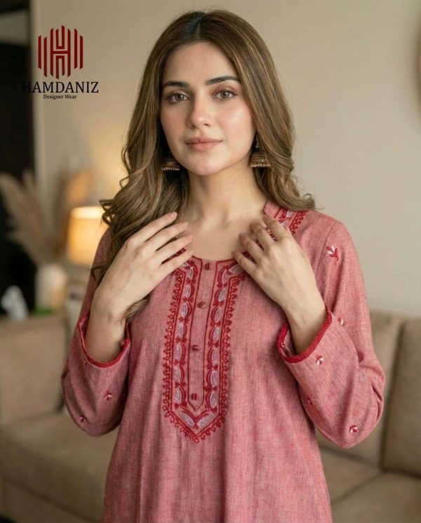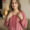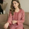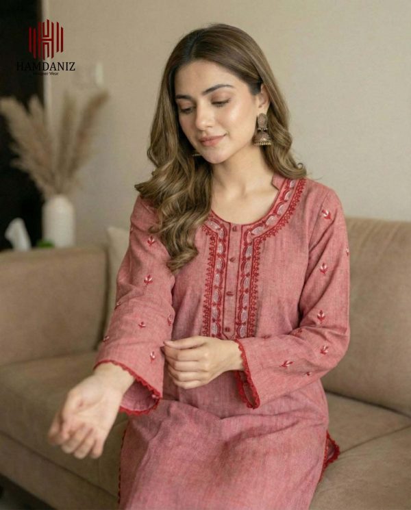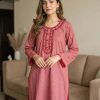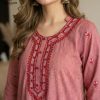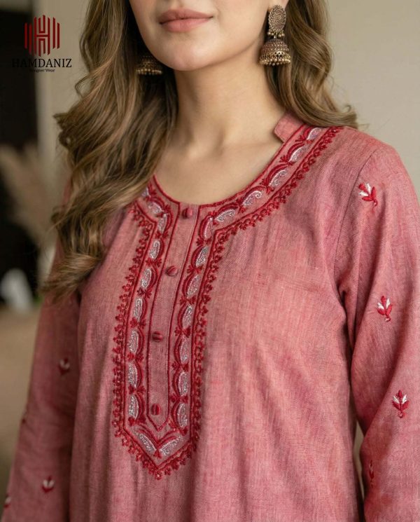 Design: Soft kurta in Dusty Rose, adorned with intricate crimson and white embroidery on the neckline and scattered across the fabric, finished with scalloped lace on cuffs and hem.